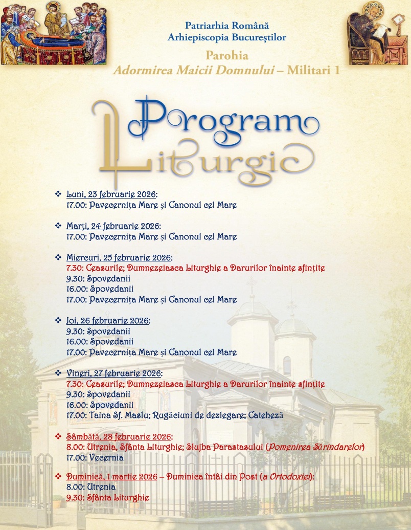 Program liturgic: Săptămâna 23 februarie-1 martie 2026